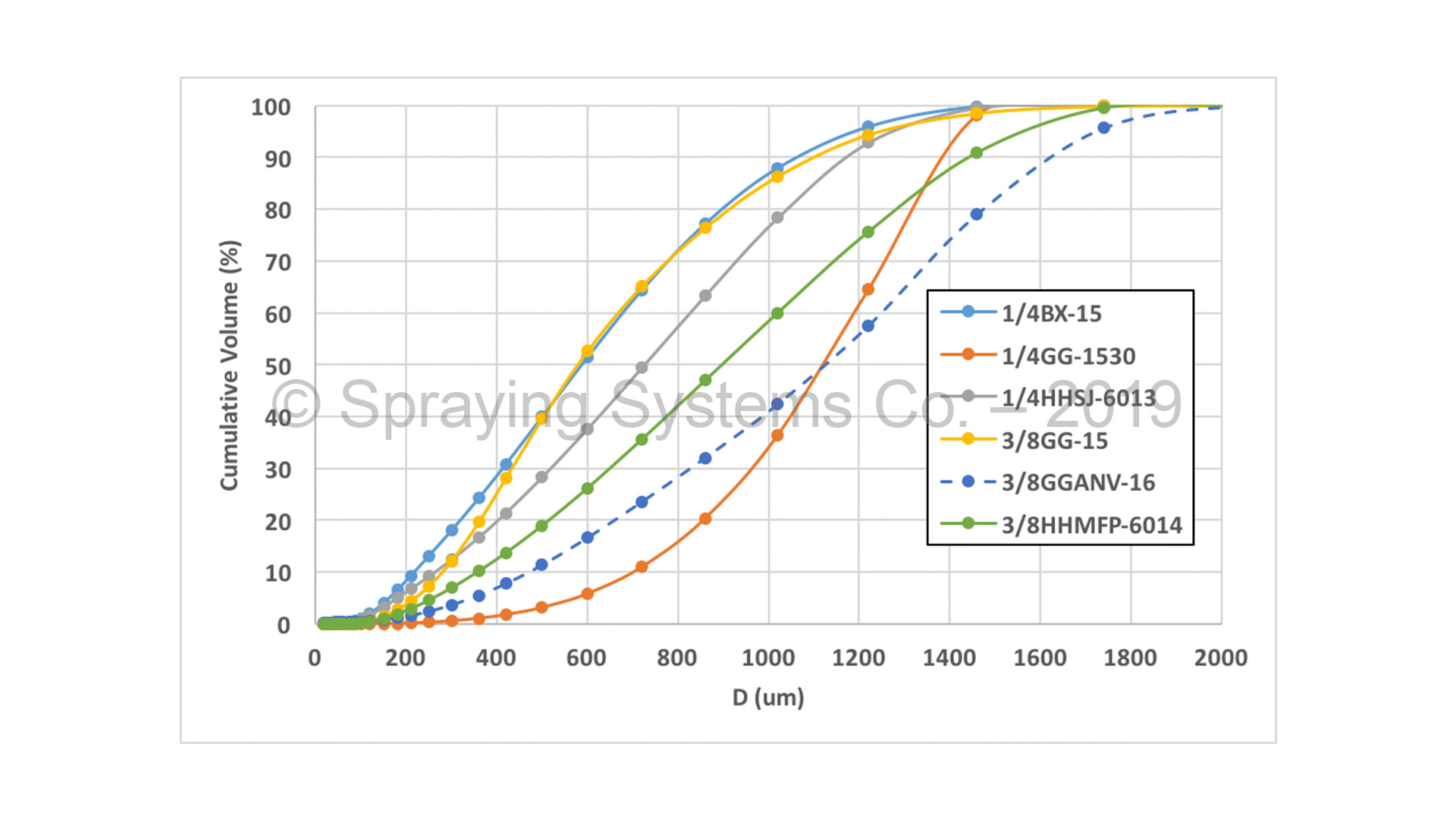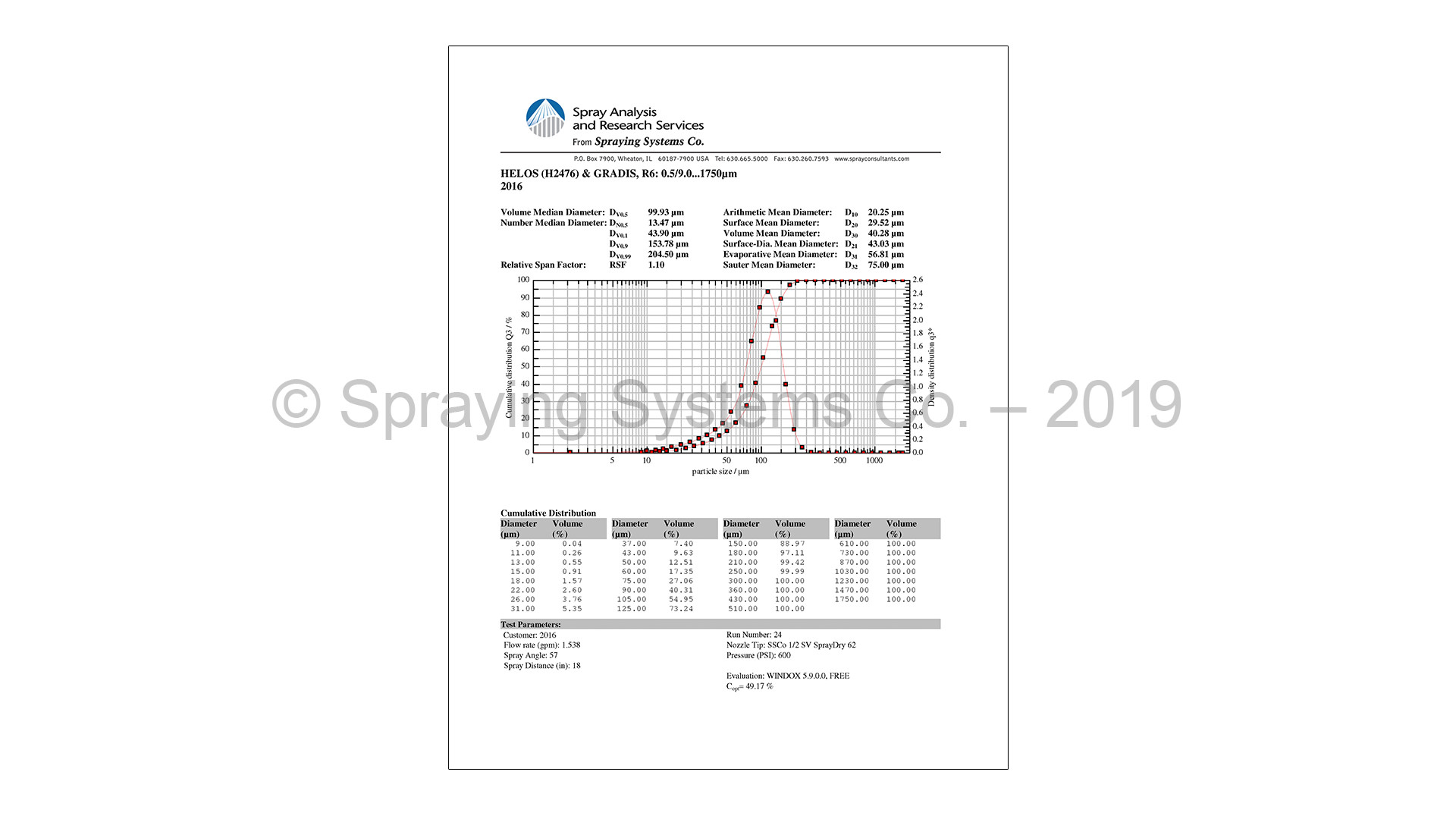 A laser unit is used to provide a collimated light source and, as droplets pass through the laser beam, a receiving unit detects the diffraction pattern. This method can quickly measure many droplets, and the information is used to develop a drop size distribution. A typical measurement practice at Spraying Systems Co. is to slowly pass the nozzle spray plume through the measurement region to obtain a single drop size distribution for the entire spray at a given spray distance. In this manner, the drop size for multiple nozzles, or multiple operating conditions, may be quickly tested and compared. Spraying Systems Co. primarily uses the Sympatec HELOS instrument, but also has multiple Malvern units.