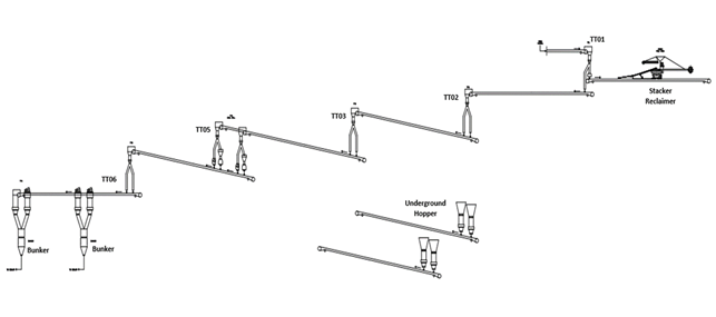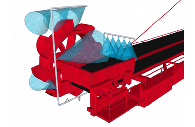 Černé uhlí pro elektrárnu Sebalang je dodáváno lodí. Z místa konečné nakládky putuje po 850 m dlouhých dopravníkových pásech do podzemního zásobníku. Na své cestě uhlí prochází pěti překládacími věžemi (obrázek 2), je drceno a několikrát překládáno. Tato překladiště jsou obzvláště kritická z hlediska emisí jemného prachu. Hydraulické trysky FogJet® 7G stříkají shora přímo na lopatkové kolo, aby se optimálně omezil jemný prach. (Obrázek 1a/b).