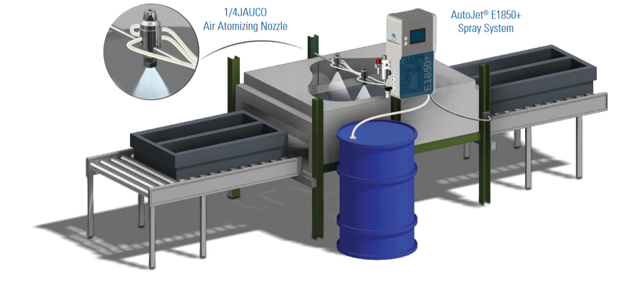 Problém vyřešil stříkací systém AutoJet® E1850+ s integrovaným membránovým čerpadlem poháněným vzduchem a dvěma vzduchovými rozprašovacími tryskami 1/4JAUCO umístěnými nad dopravníkem. Použití externích směšovacích rozprašovacích sestav vytváří úplnou atomizaci a umožňuje rozprašovat viskózní kapalinu bez jejího zahřívání. Fotoelektrický snímač spouští rozprašování separačního prostředku na každou formu při jejím pohybu po dopravníku. Automatická čisticí jehla pracuje s každým stříkacím cyklem, aby se omezilo ucpávání a zajistil se stálý a bezproblémový výkon stříkání. Řídicí jednotka nástřiku AutoJet umožňuje obsluze snadno zvýšit rychlost aplikace pro hlubší formy nebo ji snížit pro mělčí formy.