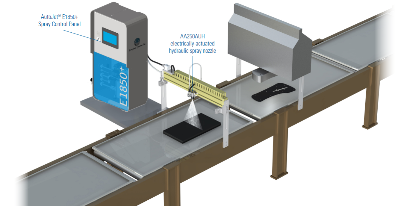 Fünf automatisierte AutoJet®-Systeme tragen nun die Stanzschmierflüssigkeit auf die Schaumstoffteile auf. Jedes System ist mit einer elektrisch betätigten hydraulischen Sprühdüse AA250AUH ausgestattet, die von einem AutoJet E1850+ Spray Control Panel gesteuert wird. Die Präzisionssprühsteuerung (PSC) stellt sicher, dass die richtige Menge an Schmiermittel auf den Schaum aufgetragen wird, auch wenn sich die Betriebsbedingungen, wie z.B. die Liniengeschwindigkeit, ändern. Das AutoJet E1850+ Spray Control Panel bietet eine Ein/Aus-Steuerung der Düse und ermöglicht eine einfache Einstellung der Durchflussmenge, um unterschiedliche Schaumformen und -dicken zu berücksichtigen.