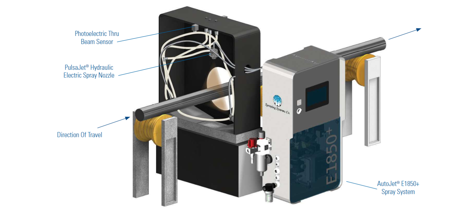 Wenn die Stahlstangen mit einem Durchmesser von 7/8 bis 3 Zoll die Sprühstation durchlaufen, wird das E1850+ System durch einen fotoelektrischen Durchstrahlsensor ausgelöst. Dieser Sensor startet und stoppt die Sprühdüsen. Diese hydraulischen Düsen wurden so montiert, dass sie eine gleichmäßige, konsistente Ölabdeckung liefern und eine niedrige Durchflussrate von 4 bis 15 Litern/Stunde und einen konstanten Flüssigkeitsdruck von 2 bar erreichen.
