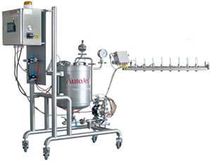 Das System enthält eine AutoJet® 2008+ Steuerung mit offenem Tank für die Flüssigkeitszufuhr und eine Membranpumpe mit automatischer Nachfüllung für eine einfache Bedienung. Der Verteiler ist mit 4 PulsaJet®-Düsen ausgestattet, um eine genaue Applikation des Bindemittels zu gewährleisten.