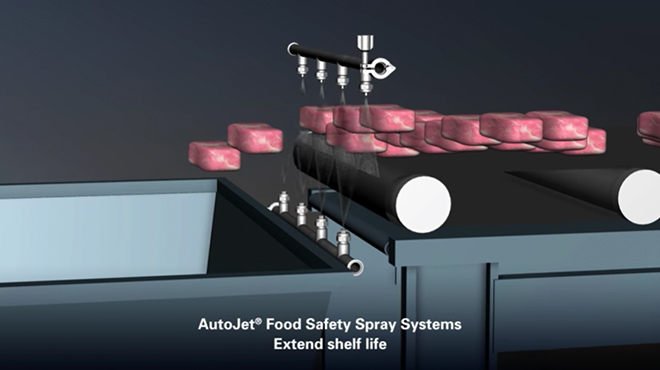 Sistema de Pulverización AutoJet® para seguridad alimentaria para bandas transportadoras y productos cárnicos frescos