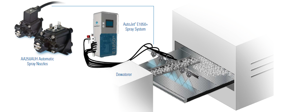 Spraying Systems Co:n ratkaisu koostui AutoJet®E1850+ -ruiskutusjärjestelmästä ja kuudella automaattisella AA250AUH-ruiskutussuuttimella varustetusta keräimestä. Ruiskutuspääty levittää irrotusaineen ohuena, tasaisena kalvona ruostumattomasta teräksestä valmistetun kuljettimen koko leveydelle. AutoJet®-järjestelmässä käytetään Precision Spray Control (PSC) -järjestelmää, joka tuottaa erittäin alhaisia virtausnopeuksia. Kun linjan nopeus muuttuu, käyttäjät voivat helposti säätää suuttimien virtausnopeutta muuttamatta painetta. Tämä tapahtuu säilyttäen samalla tasaisen ruiskutuksen peittävyyden ja pisarakoon. Koska AA250AUH-suuttimet käyttävät vain matalapaineista hydraulista sumutusta, sumua ja ylisumua vältetään.