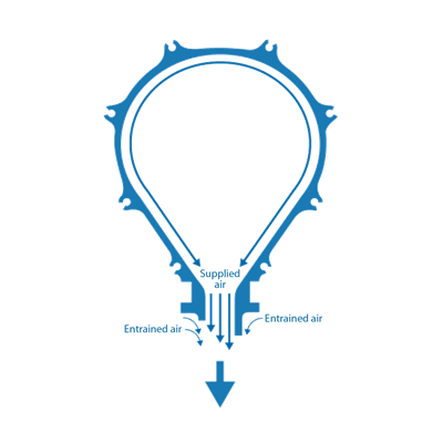 L'effet Coandă induit l'air fourni à se fixer à la surface de la lame d’air et aide à maintenir l'intégrité du flux d'air plus en aval. Cet effet crée également une condition propice à l'entrée d'air ambiant pour augmenter le volume total d'air.