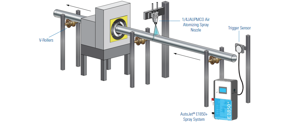 Megoldásunk egy AutoJet® E1850+ Spray rendszert és egy levegőporlasztó fúvókát használ . Egy közelségérzékelő indítja be a permetezőfúvókát minden egyes sáv elején és végén. Az 1/4JAUPMCO légporlasztó fúvóka finom ködöt bocsát ki, amely a víz csaknem 100%-os elpárolgása mellett hűti a rudakat. A fúvóka tisztítótűvel van ellátva a nyílás eltömődésének megakadályozása érdekében. A rendszer lehetővé teszi az áramlási sebesség egyszerű beállítását is, hogy figyelembe vegye a környezeti hőmérséklet egész évben bekövetkező változásait.