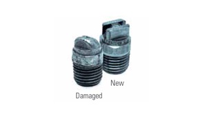 A fúvóka anyagának fokozatos eltávolítása megnöveli a fúvóka nyílását és a belső áramlási járatokat - növeli az áramlási és a permetcseppek méretét, csökkenti a nyomást és torzítja a permetmintát. További információ a fúvókák kopásának észleléséről>