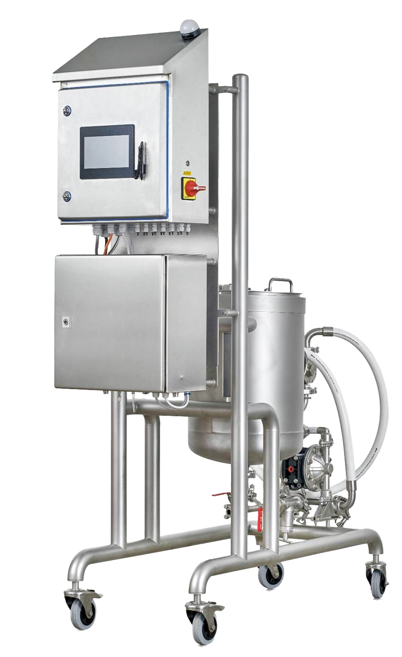 In this scenario, the ideal solution was our AutoJet® F1850+ spray controller paired with a hygienic header and 20L pressure tank. The header is equipped with 16 air atomizing spray guns, allowing the customer to select from three different nozzle numbers to match the mold dimensions. The nozzles are precisely positioned to ensure each mold is sprayed accurately, eliminating overspray.