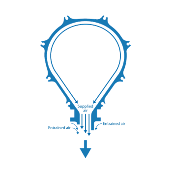 Un amplificatore d’aria variabile è un’altra opzione per l’uso di aria compressa. Un amplificatore d’aria produce un flusso d’aria costante ad alta velocità, ideale per operazioni di asciugatura o soffiaggio molto mirate. L’efficienza è ottimizzata perché, insieme al flusso di aria compressa, viene convogliata nell’unità ulteriore aria libera in ambiente.