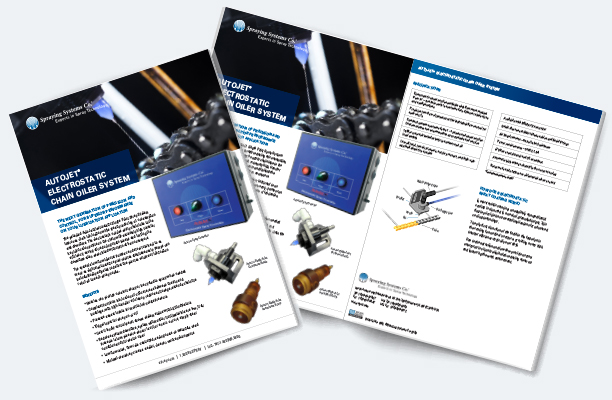 Il sistema brevettato AutoJet® Electrostatic Chain Oiler System migliora la lubrificazione della catena riducendo notevolmente il consumo di olio e il tempo di fermo. Gli ugelli elettrostatici applicano il lubrificante per catena ai punti chiave di lubrificazione sulla catena con un'efficienza di trasferimento estremamente alta, risparmiando olio, riducendo le rotture della catena e limitando i tempi di fermo spesso associati ai trasportatori a catena.