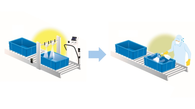 初期工程で練り上げた水飴は次工程に移る過程で、一度番重で受けて仮保管をします。練り上げた水飴は粘性が高くべたつき強いため、番重にそのまま入れてしまうと、くっついてしまい次工程に移せなくなります。そこで同工場では番重に離型油を塗布し対応していました。離型油は人手によりハンドスプレーで規定回数をスプレーすることで塗布をしていました。人手による塗布は、番重内面に確実に塗布をするために多めにスプレーをしており、結果、過剰塗布となり、離型油の費用が嵩み問題視されていました。またミスト飛散による周辺への汚れも問題となっていました。