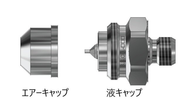 - スプレーセットアップはエアーキャップと液キャップから構成されており、 液をノズルの内部または外部で混合します。