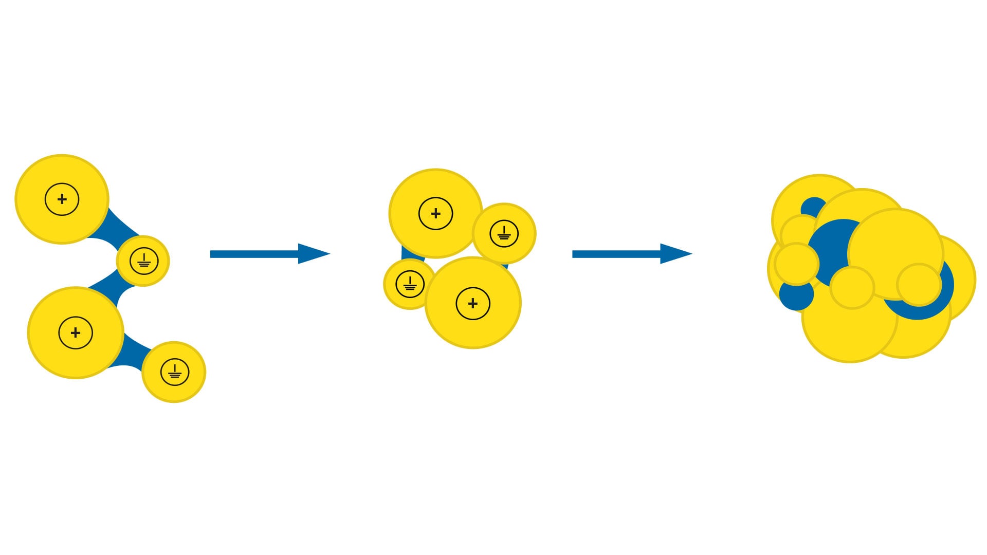 분사되는 입자에 가해지는 전압을 제어함으로써 일부 입자는 외부 쉘을 쉽게 형성하는 반면 다른 입자는 점차적으로 쉘을 발달시켜 습윤되거나 끈적한 입자를 생성하게 됩니다. 이러한 두 종류의 입자가 달라붙기 때문에, 함께 충돌하고 결합되어 과립화된 입자를 형성합니다. 결과적으로 미세한 입자를 가진 더 큰 입자가 생성됩니다.