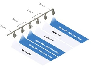 Jutikliai įspėja sistemą apie įeinantį stiklą (greitį, plotį, ...) ir įjungia elektra valdomus PulsaJet® purkštukus, kurie padengia reikiamas zonas. Valdiklis labai greitai įjungia ir išjungia "PulsaJet®" purkštukus, kad būtų kontroliuojamas srauto greitis ir akimirksniu užtikrinamas nuoseklus, tolygus dengimas su minimaliu cheminių medžiagų švaistymu.