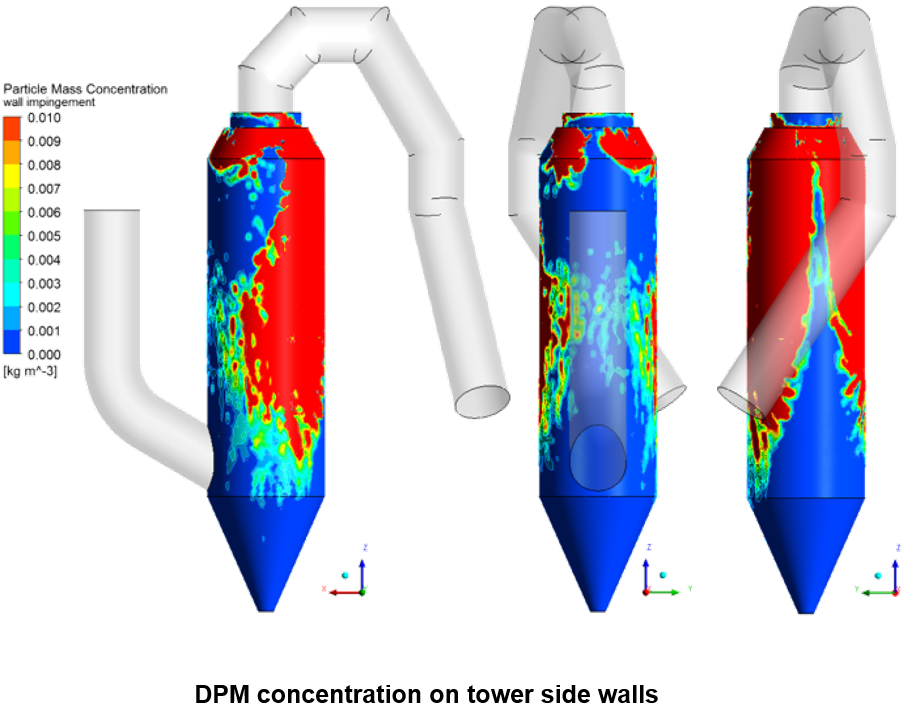 Kai vizualizavome pagal temperatūros gradientus nuspalvintą purslų pliūpsnį, kaip parodyta toliau, nustatėme, kad šeši purkštukų antgaliai, išdėstyti nedideliais atstumais tiesiai priešais dujų įleidimo angą, veiksmingai garina purslus ir neleidžia sudrėkti sienelėms. Be to, toks purkštukų išdėstymas gerokai sumažino dulkių susikaupimą visame bokšte.