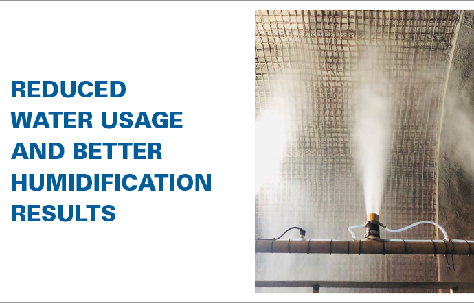 Som en løsning bestemte vi oss for et FogJet® fuktighetssystem som kombinerer flere Spraying Systems Co.-produkter: