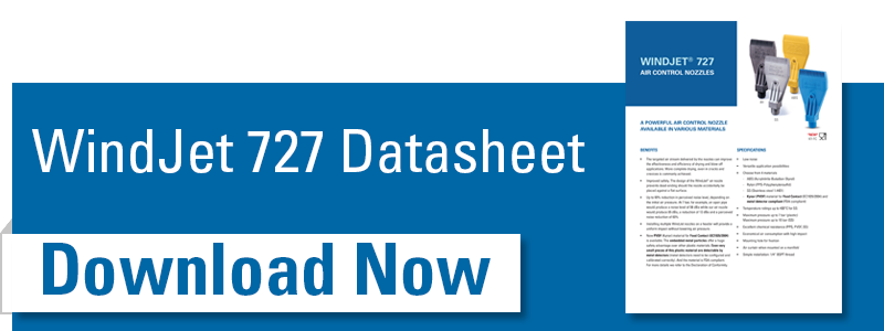 WindJet® luftdyser av næringsmiddelkvalitet bruker et minimum av trykkluft og kan ettermonteres på eksisterende luftarmaturer. Takket være den nye blå plasten med metalldetekterbart materiale er WindJet® matvaredysen nå også lett påviselig for metall med røntgen- og synsdeteksjonssystemer.