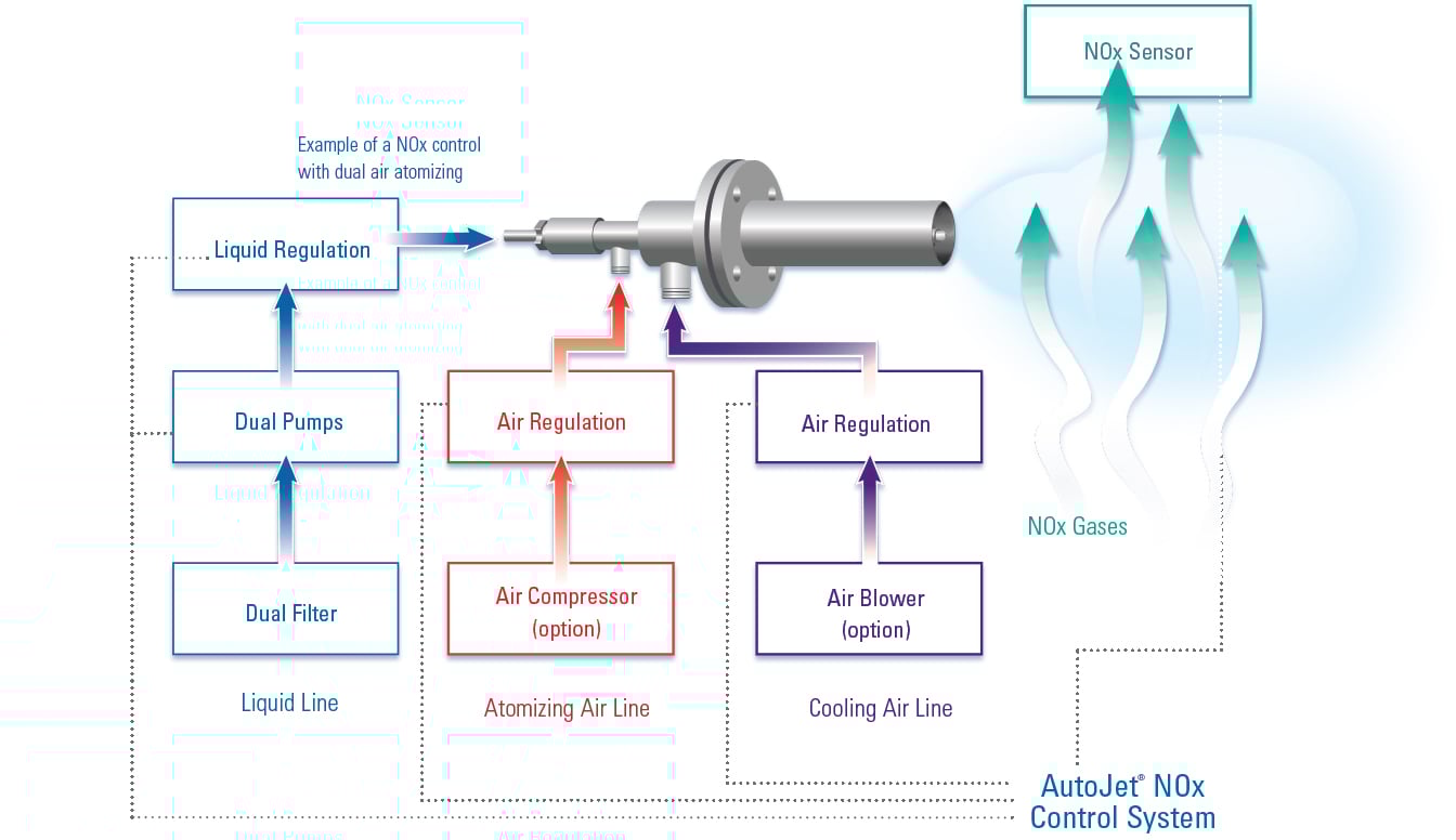 - Optymalną wydajność: System AutoJet® NOx Control System monitoruje i automatycznie reguluje system w pętli zamkniętej. Przepływ cieczy i powietrza do dysz jest regulowany w oparciu o dane zebrane przez czujnik NOx.