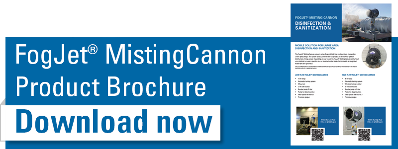 FogJet® MistingCannon este soluția ideală pentru dezinfectarea și igienizarea suprafețelor mari. Este disponibil într-o configurație cu debit redus și cu debit ridicat - în funcție de gama de pulverizare. Sistemul utilizează un ventilator puternic pentru a răspândi un jet de ceață* pentru dezinfectarea optimă a zonelor mari. În funcție de nevoile dumneavoastră, FogJet® MistingCannon poate fi fixat pe o platformă pentru a acoperi o anumită zonă sau montat în spatele unui camion cu un rezervor de apă și un generator integrat.