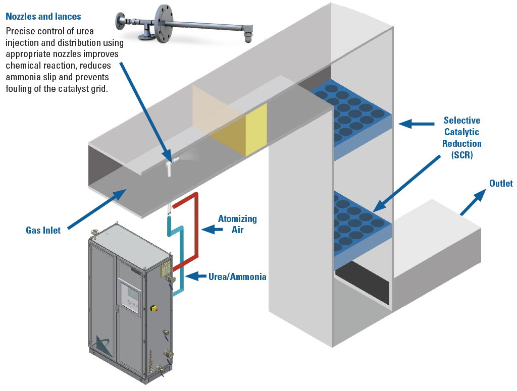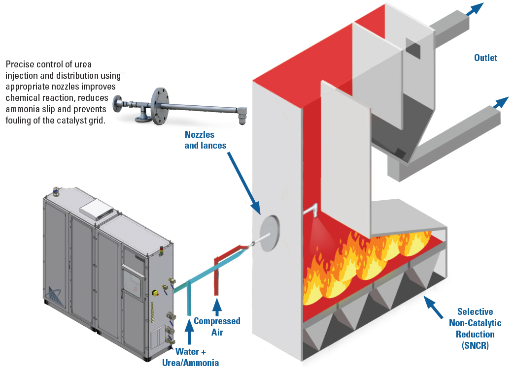 Prin utilizarea tehnologiei avansate de pulverizare, Spraying Systems Co. este un partener important pentru a controla emisiile de NOx. Pe baza situației dumneavoastră specifice, inginerii noștri proiectează o soluție adecvată pentru a injecta amoniac sau uree în fluxul de gaze. Aceasta poate fi utilizată atât pentru reducerea catalitică selectivă (SCR), cât și pentru reducerea necatalitică selectivă (SNCR).