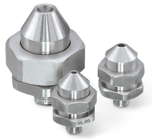 - Eficiente chiar și în medii dure: O gamă largă de materiale asigură performanța optimă a duzei chiar și în aplicații cu temperaturi ridicate și corozive. Printre materialele tipice se numără oțelul inoxidabil 316 și 310, HASTELLOY®, Stellite® și carbura de siliciu legată prin reacție. Altele sunt disponibile la cerere.