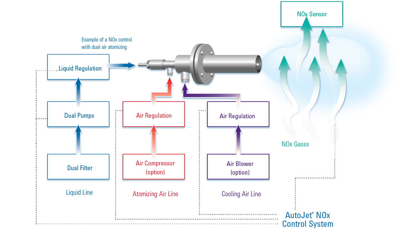 Sistemul de control al NOx monitorizează continuu feedback-ul de la senzorul (senzorii) de NOx și reglează răspunsul sistemului prin ajustarea proporțională a fluxului de lichid și de aer către duzele injectoarelor.