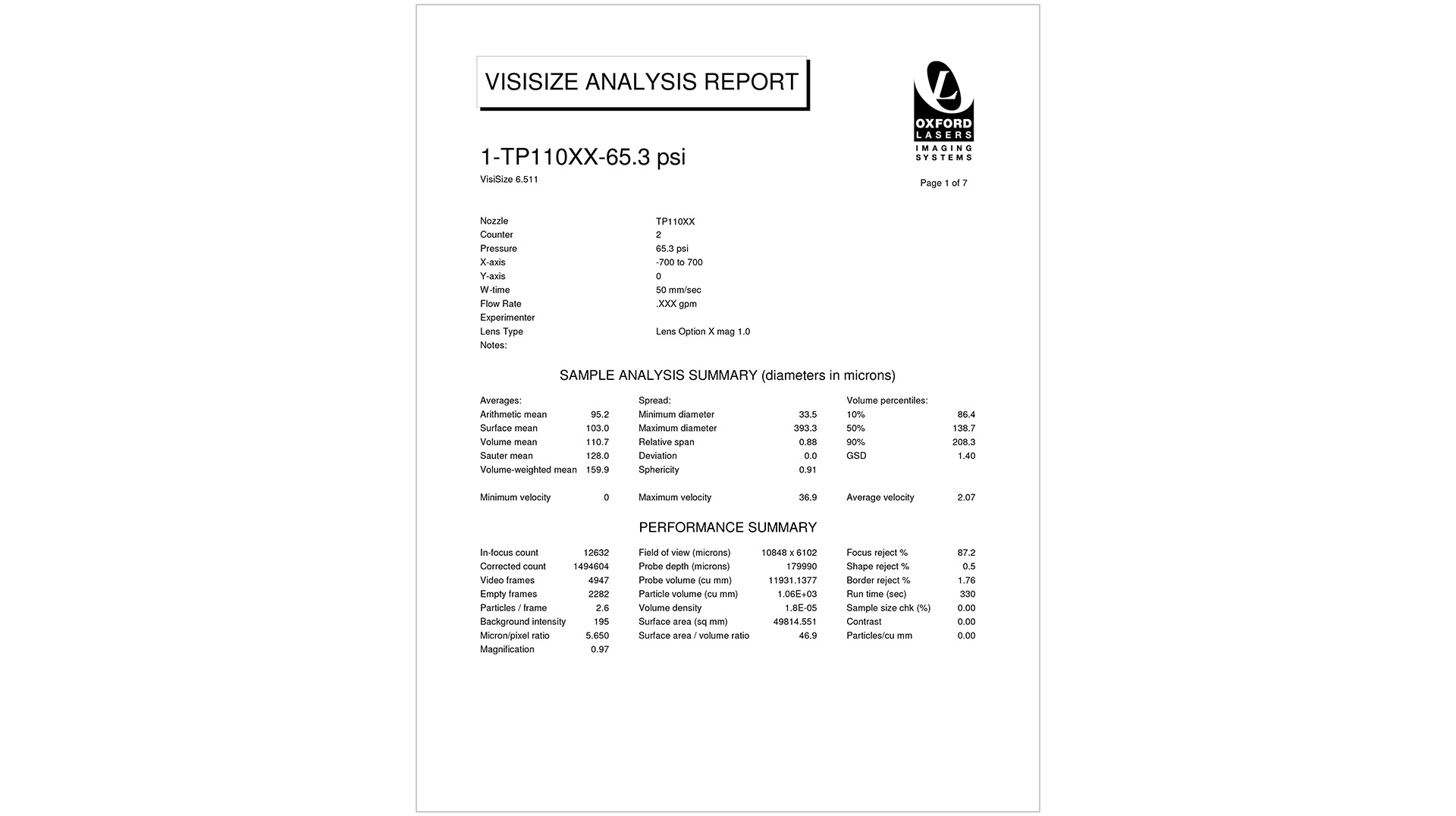 Imaginile sunt calibrate spațial și, prin urmare, au o referință de scală de lungime asociată cu fiecare cadru de imagine, permițând măsurarea dimensiunii picăturilor/particulelor. În plus, pot fi achiziționate perechi de imagini pentru a urmări mișcarea picăturilor și a determina caracteristicile de viteză. Din aceste imagini se pot determina și alte caracteristici, inclusiv sfericitatea, conținutul de solide și concentrația. Spraying Systems Co. utilizează instrumentul Oxford Imaging VisiSizer.