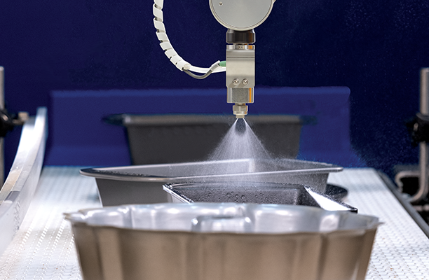 To deliver a consistent, repeatable oil film on every pan, we supplied a compact, easy-to-maintain spray package consisting of a 5-liter pressure tank with quick-release couplings, an AutoJet® E250+ timing controller, and an automatic Air Atomizing spray nozzle fitted with a special fluid cap engineered for high-viscosity media such as thick oils and fats.