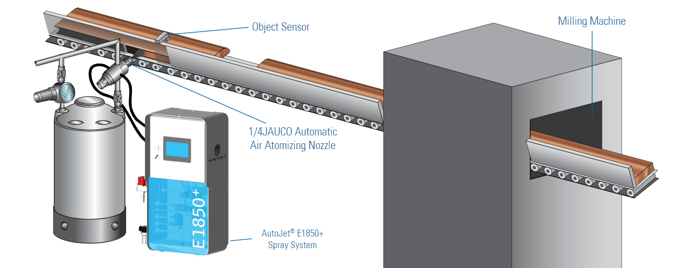 Riešenie spoločnosti Spraying Systems Co. využíva vzduchovú rozprašovaciu dýzu riadenú systémom AutoJet® E1850+. Pigment sa do systému dodáva zo 40-litrovej tlakovej nádrže. Systém striekania pigmentu AutoJet spustí trysku na striekanie vždy, keď je dopravník v pohybe a snímač objektu zistí podlahovú dosku. Ak sa dopravník zastaví alebo ak nie je prítomná žiadna doska, nespustí sa žiadny postrek.