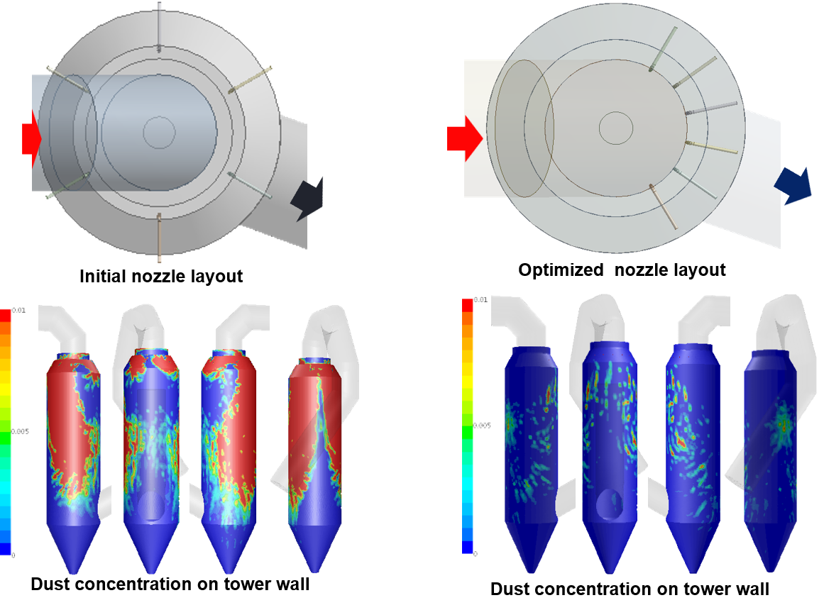 Keď sme vizualizovali rozprašovaciu špirálu zafarbenú teplotnými gradientmi, ako je znázornené nižšie, zistili sme, že šesť dýz umiestnených v tesných intervaloch priamo oproti vstupu plynu účinne odparuje rozprašovanú vodu a zabraňuje zmáčaniu stien. Okrem toho toto usporiadanie dýz výrazne znížilo hrudkovanie prachu v celej veži.