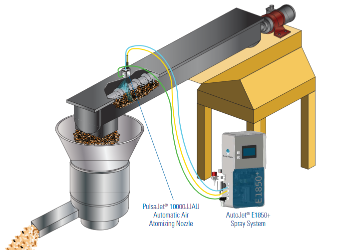 Rešitev podjetja Spraying Systems Co. je sestavljena iz razpršilnega sistema AutoJet® E1850+, opremljenega z zračno membransko črpalko in avtomatsko razpršilno šobo PulsaJet® 10000JJAU. Razpršilni sistem prilagaja električno krmiljeno razpršilno šobo na podlagi vhodnega signala 4-20 mA, ki sporoča tonažo obdelovanega lesa. Samodejno krmiljenje pretoka z uporabo natančnega nadzora razprševanja (PSC ) namesto z nastavljanjem tlaka tekočine omogoča takojšnjo prilagoditev pretoka ter ohranja optimalno velikost kapljic in kot razprševanja, kar zagotavlja enakomerno pokritost lesnih sekancev.