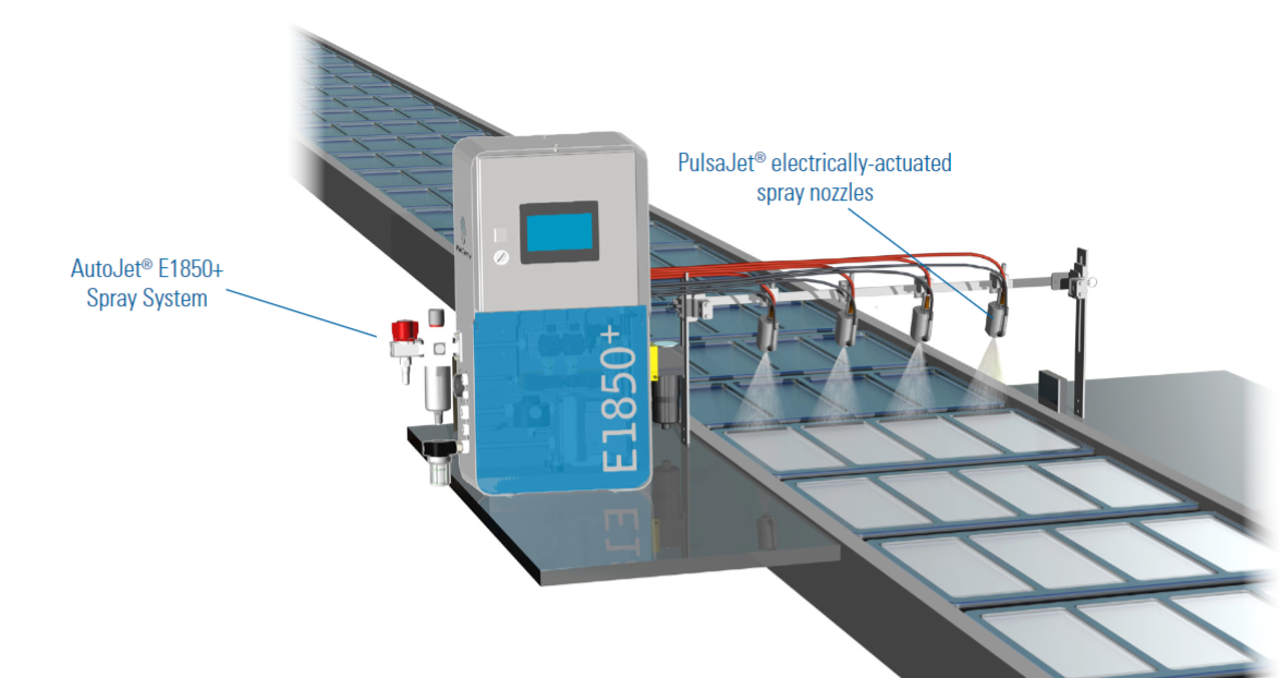 Sredstvo za ločevanje zdaj uporablja avtomatiziran sistem za razprševanje AutoJet®. Sistem, ki ga nadzoruje razpršilni sistem AutoJet E1850+, uporablja električno krmiljene hidravlične šobe PulsaJet® za natančen nanos ustrezne količine sredstva za ločevanje na vsak kalup. Precizni nadzor razprševanja (PSC ) prilagodi pretok glede na delovne pogoje, kot je spreminjanje hitrosti linije. Sistem uporablja tudi senzorje za zaznavanje prisotnosti kalupov, kar zagotavlja, da sistem brizga samo, ko so kalupi prisotni.