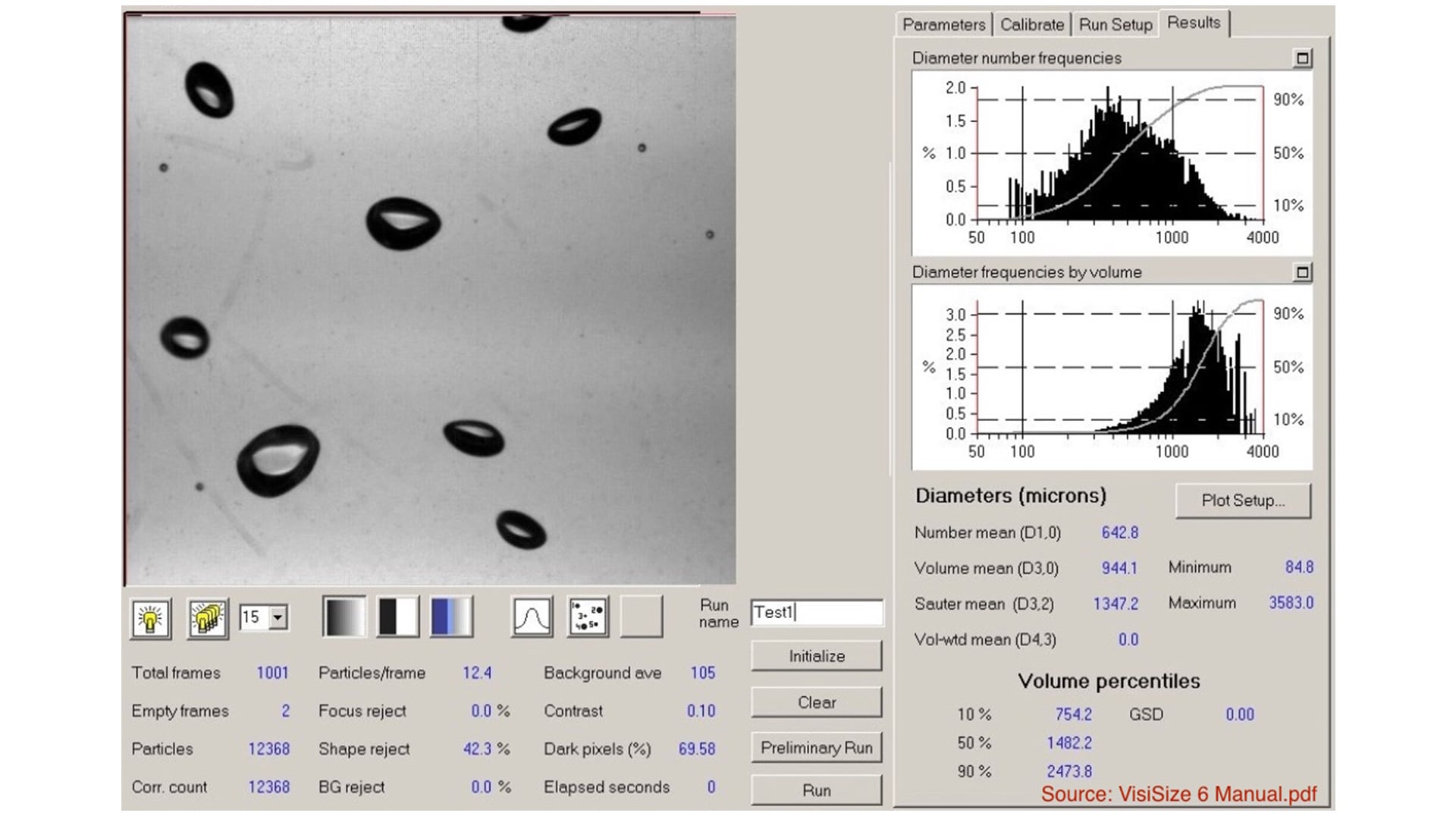 The images are spatially calibrated and thus have an associated length scale reference with each image frame, allowing for measurement of the droplet / particle size. Furthermore, image pairs may be acquired in order to track droplet movement and determine velocity characteristics. Other characteristics may be determined from these images as well, including sphericity, solids content and concentration. Spraying Systems Co. uses the Oxford Imaging VisiSizer instrument.