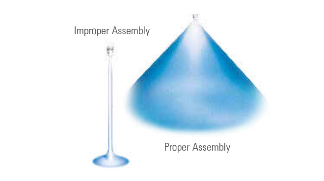Поступове зтирання матеріалу форсунки призводить до збільшення розпилюючого отвору і внутрішніх протоків — збільшуючи розхід рідини і розмір краплі, зменшуючи тиск, і руйнуючи схему розпилення. Дізнатися більше про знос форсунок >